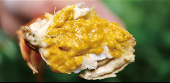 黃油相融,難分彼此。油膏浸滿整只蟹身,腹肉、蟹腿、蟹螯,甚至蟹腮,全身都金黃透光。細(xì)細(xì)品嘗,渾身散發(fā)一股霸道的鮮甜,是普通青蟹的10余倍,簡(jiǎn)直就是“人間尤物”。
