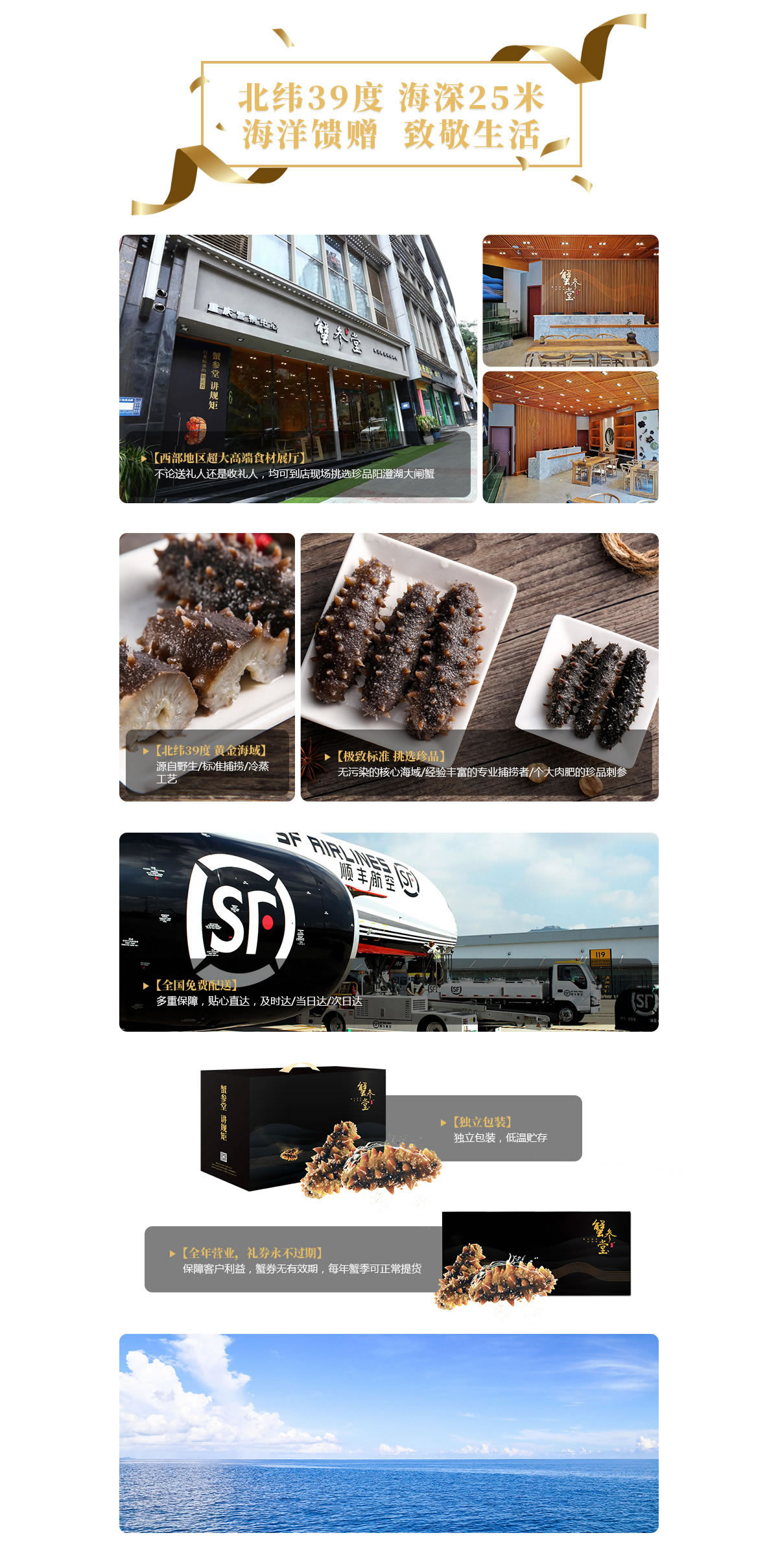 保存方法:蟹參堂所售海參均采用75°低溫冷蒸技術,最大限度保留了海參的營養元素,收到后需低溫冷凍保存。